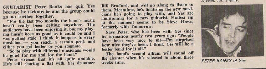 Guitarist Peter Banks is sacked by Yes. Hes replaced by ex-Tomorrow and Bodast man Steve Howe.