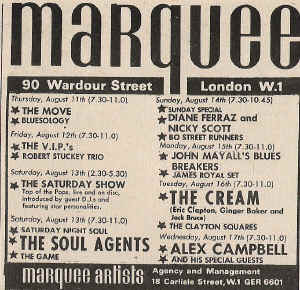 Flamingo Club-Zoot Money (12th, 13th), Shotgun Express (19th, 20th), Cream (27th/ 28th All Night Rave)