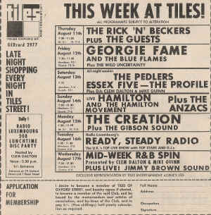Tiles Club-Pinkertons Assorted Colours (1st), The Checkmates, The Riot Squad (5th), The Klubs, The Eyes Of Blue (6th), Wild Uncertainty (12th), Profile (13th), The Creation (15th), Merseys (19th), Johnny Gustafson & John Banks (20th), Felder's Orioles, The Warriors (21st), Mindbenders, Wynder K Frog (22nd)