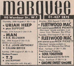 Hampstead Country Club- Jam session with the old Blossom Toes & Friends (1st), Bronco (4th), David Bowie (11th), Jack Bruce (26th)