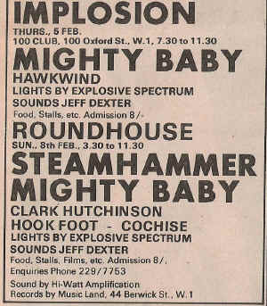 Roundhouse-Mighty Baby, Hawkwind (5th), Steamhammer, Mighty Baby, Cochise, Hookfoot, Clark-Hutchinson (8th), Caravan, David Bowie & the Hype (11th), Mighty Baby, Trader Horne, Hawkwind, Little Free Rock, Skin Alley, Aardvark (15th), Viv Stanshalls Big Grunt (28th)