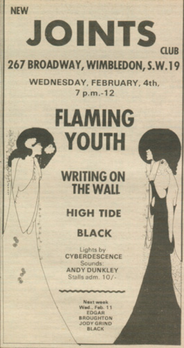 Joints Club, Wimbledon-Flaming Youth, Writing On The Wall, High Tide (4th), Edgar Broughton Band, Jody Grind (11th)