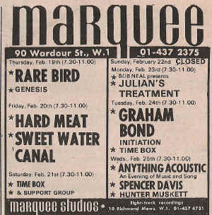 Watford, New Penny-Juniors Eyes (5th), Hard Meat (12th), Mott the Hoople (19th), Graham Bond Initiation (26th)