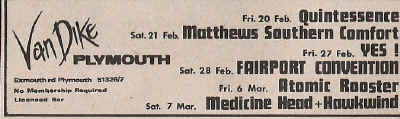 Redcar Coatham Hotel-Renaissance, Grisby Dyke (1st), Blodwyn Pig (15th), Fairport Convention (22nd)