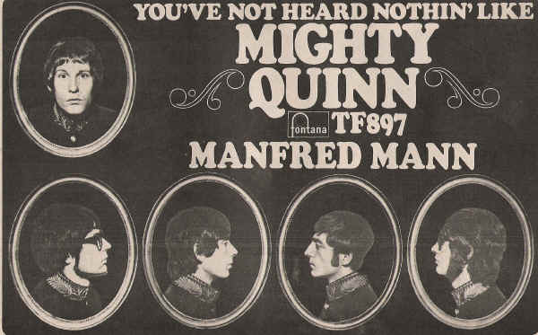 Mighty Quinn : This is a new Dylan song, and thoroughly intriguing it is too. Mike D'Abo handles the lyric forcefully, with fascinating harmony support from the other lads--and there's a punch-packed backing, in which walloping drums and organ are prominent. The melody isn't outstanding but there's more than enough in the lyric and the superb performance to guarantee a deserved Chart return for Manfred.