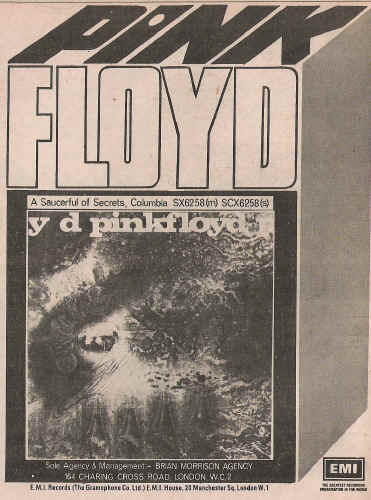 A Saucerful Of Secrets (LP): Exciting, penetrating, experimental sounds by Britain's top psychedelic group, much maligned and misunderstood. They really score on recording rather than 'live' performances, particularly on the eerie title track, which proves that the experiments in jazz, pop, contemporary serious music and electronics are all moving in the same direction.