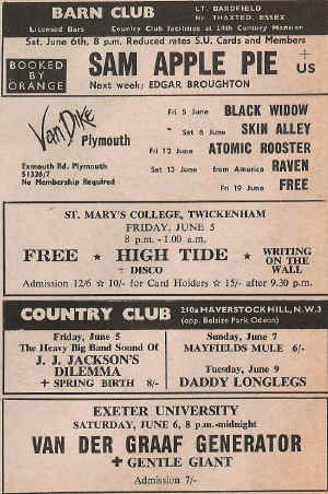 Bar Farx-Black Widow, Quiver (6th), Free (13th), Edgar Broughton Band (20th)
