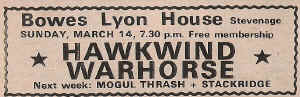 Stevenage, Bowes Lyon House- Stud, Anno Domini (7th), Hawkwind, Warhorse (14th), Mogul Thrash, Stackridge (21st), Stray (28th)
