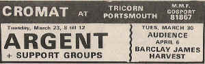 Portsmouth Tricorn Club-Mushroom (5th), Fortunes (6th), Madrigal (8th), Viv Stanshall, Paladin (9th), Dada (11th), Cupid’s Inspiration (12th), If (16th), Onyx (20th), Argent (23rd), Dog That Bit People (26th), Audience (30th), Dog That Bit People (31st)