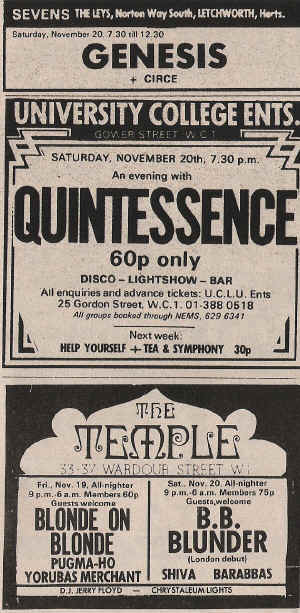 London University College- Sandy Denny (2nd), Hawkwind (6th), Philip Goodhand-Tait, Brewer's Droop (13th), Quintessence (20th), Al Stewart (23rd), Help Yourself, Tea & Symphony (27th)