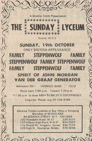 London Lyceum-Soft Machine, Van Der Graaf Generator (5th), Led Zeppelin, Audience, Frosty Noses (12th), Family, Van Der Graaf Generator, Spirit Of John Morgan (19th-supporting Steppenwolf), Fleetwood Mac, Deep Purple, Renaissance, Aardvark, Andromeda (24th), Rare Bird, Procol Harum (26th)